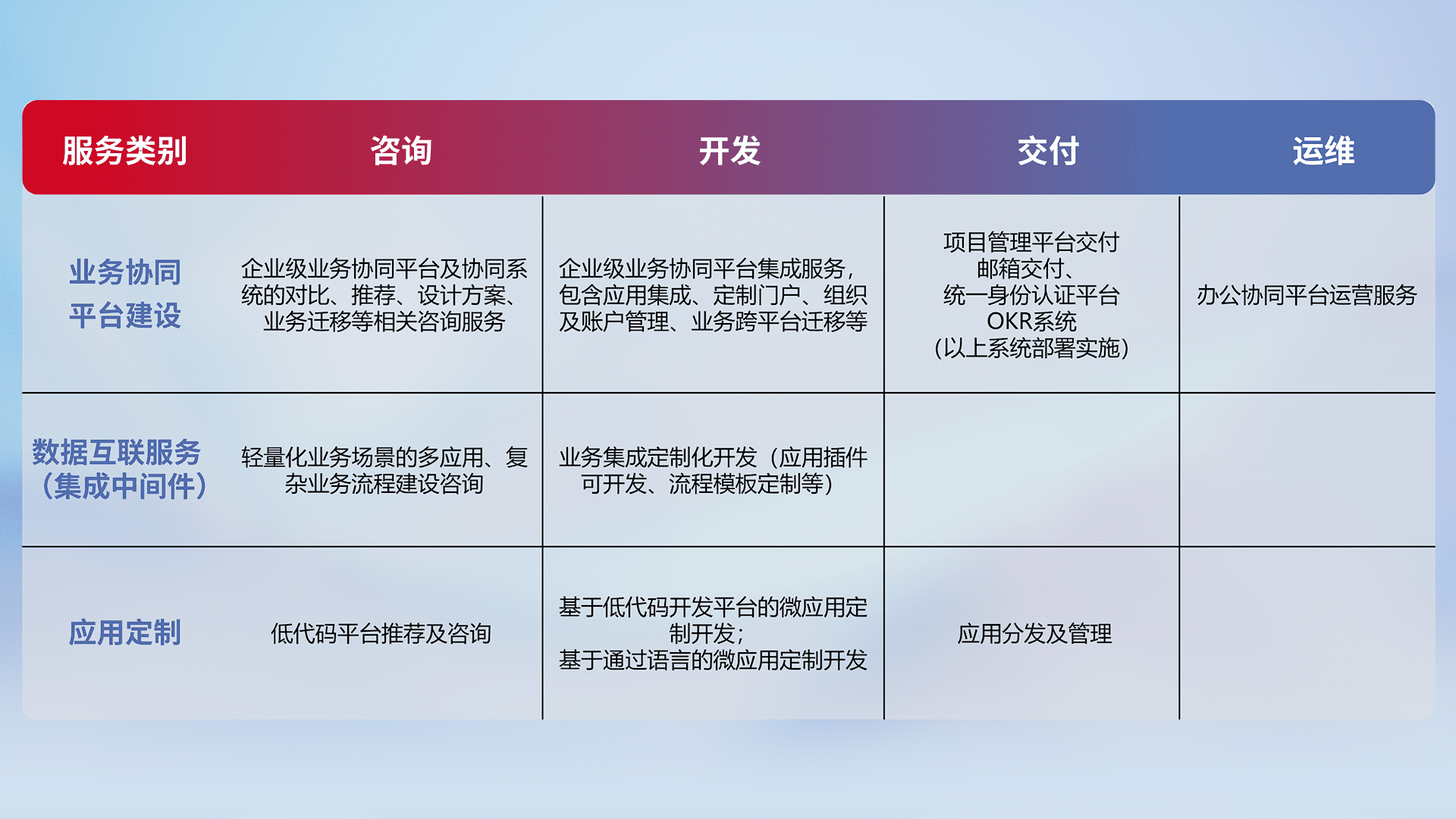针对钉钉、、、、企微、、、、IDaas等平台级产品提供产品的规划、、、、方案、、、交付、、、、定制化开发等服务,,,实现如统一协同办公、、、智能客户服务、、、、混合会议管理、、、智能数据查询、、、、等业务场景,,,,实现数字化转型。。。。